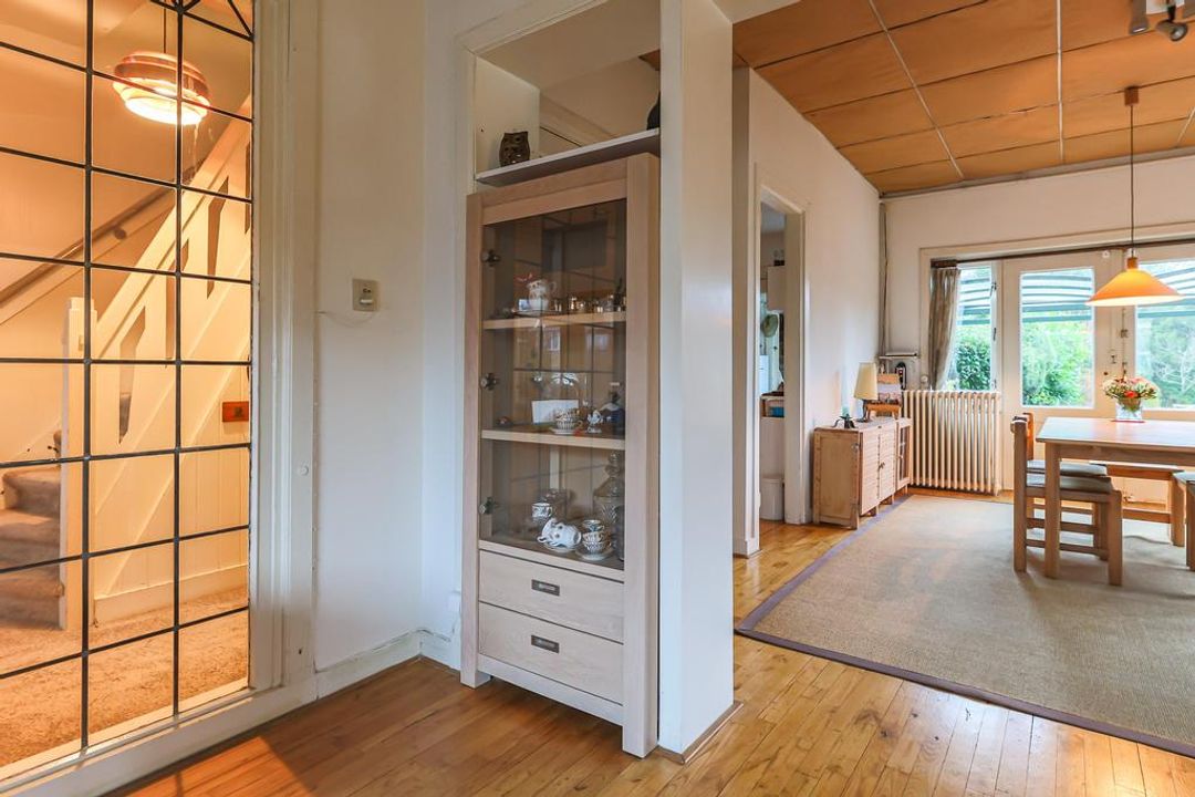 Indeling: overdekte entree, hal met originele tegels en granito vloer, toilet, provisiekelder, sfeervolle woonkamer met erker, houtkachel, massief eiken vloer en openslaande tuindeuren, eenvoudige keuken met dubbele spoelbak, bijkeuken met wasmachine-aansluiting en achterdeur, berging met c.v.-opstelling en uitstortgootsteen.