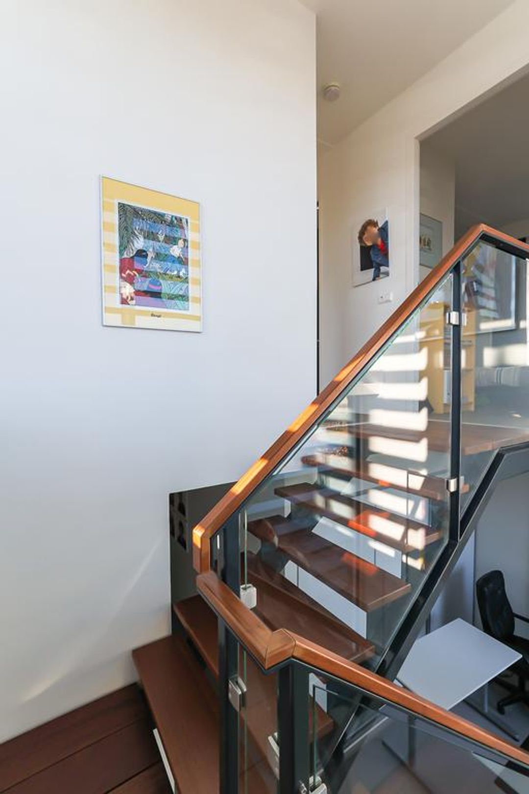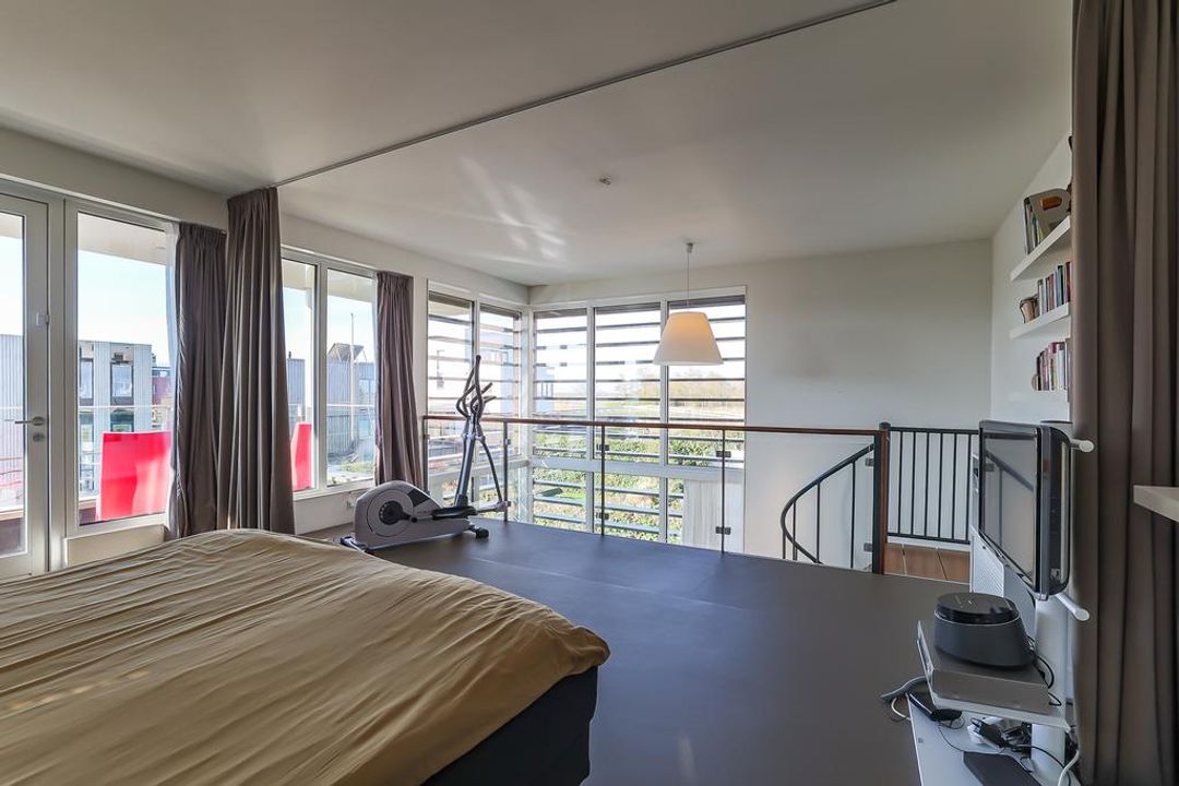 1e verd.: via een bordestrap in de hal is de eerste verdieping bereikbaar, maar ook vanuit de woonkamer is een spiltrap die in verbinding staat met de royale ouderslaapkamer met een vide en fantastisch uitzicht over De Onlanden, aansluitend een complete badkamer met ligbad, inloopdouche, toilet en dubbele wastafel, royaal balkon op het zuiden, walk-in closet, slaapkamer met kastenwand en balkon op het westen, slaapkamer, slaapkamer met deur naar balkon op het westen, badkamer met douche, wastafel en toilet.